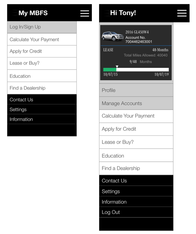 I designed the wireframes for these screens for Mercedes-Benz Financial Services to build out their existing My MBFS app, which was optimized for tablet. This project required several new features to be designed from scratch, as well as a new more robust navigation scheme.